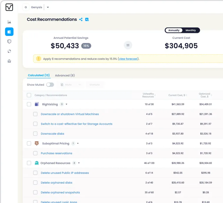 Identifies all Azure waste, highlighting and prioritizing savings recommendations bringing clarity to cloud spend.